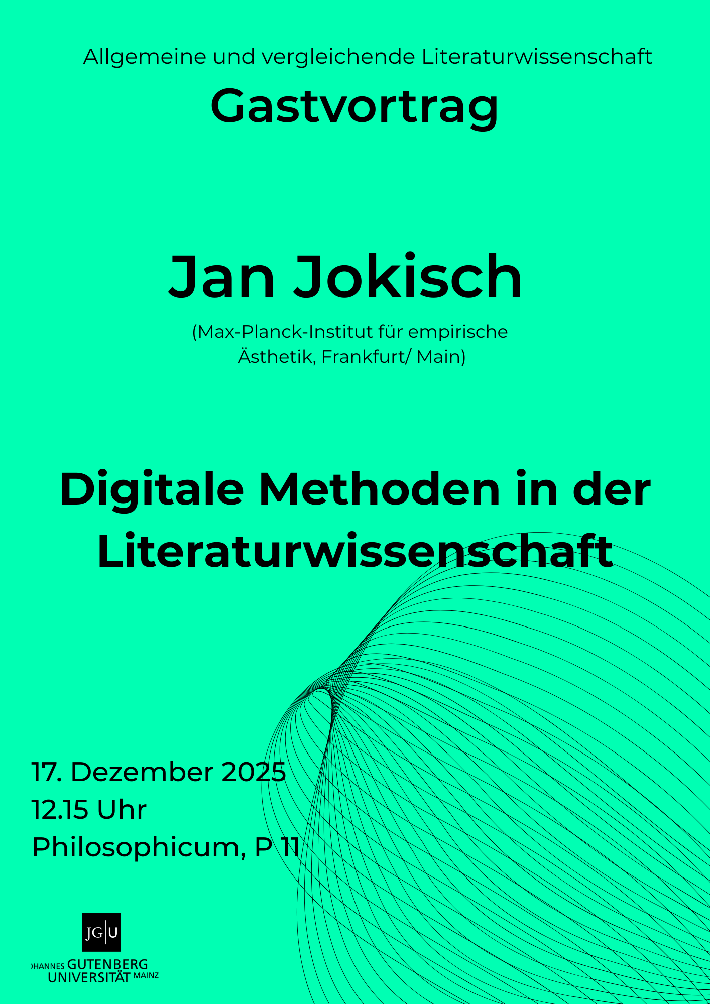 Am Mittwoch, den 17. Dezember 2025 hält Jan Jokisch vom "Max-Planck-Institut für empirische Ästhetik" einen Vortrag über Digitale Methoden in der Literaturwissenschaft. Der Gastvortrag ist Teil der Ringvorlesung "Einführung in die Allgemeine und Vergleichende Literaturwissenschaft" und findet um 12:15 Uhr in Raum P 11 des Philosophicums statt. Die Veranstaltung ist für alle Interessierten geöffnet.